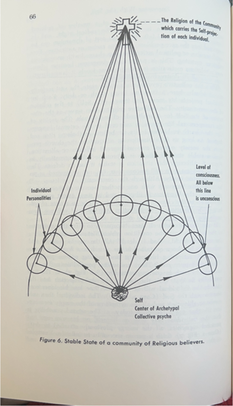 The image below from Edward Edinger’s Ego and Archetype demonstrates how organized religion can act as a group container for the Self. In this configuration, each individual member (illustrated by the circles at the bottom) need not have a personal relationship with the divine, because it is carried by the Church itself. This, Edinger says, is a stable state for a community.