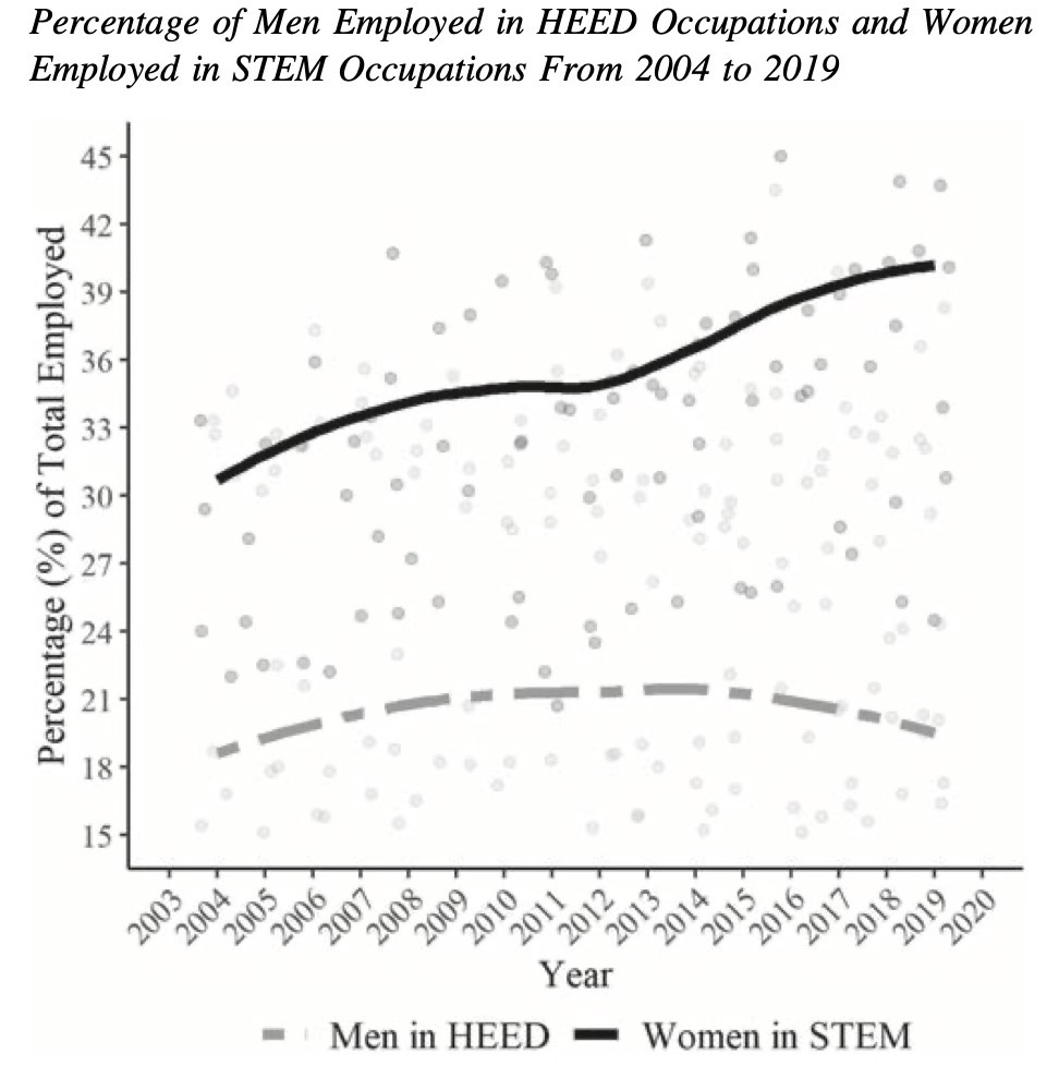 The diagram below is from an article entitled “Gender Segregation in Culturally Feminized Work: Theory and Evidence of Boys’ Capacity for Care4. While it’s cool to see that more women have entered STEM (Science, Technology, Engineering and Math) professions, it’s also powerful to see that fewer men have entered HEED professions (Health Care, Early Education, and Domestic roles). These roles continue to be “feminized”— and lower-paid. HEED roles are caring roles, in which both affective and emotional labor are implicit.