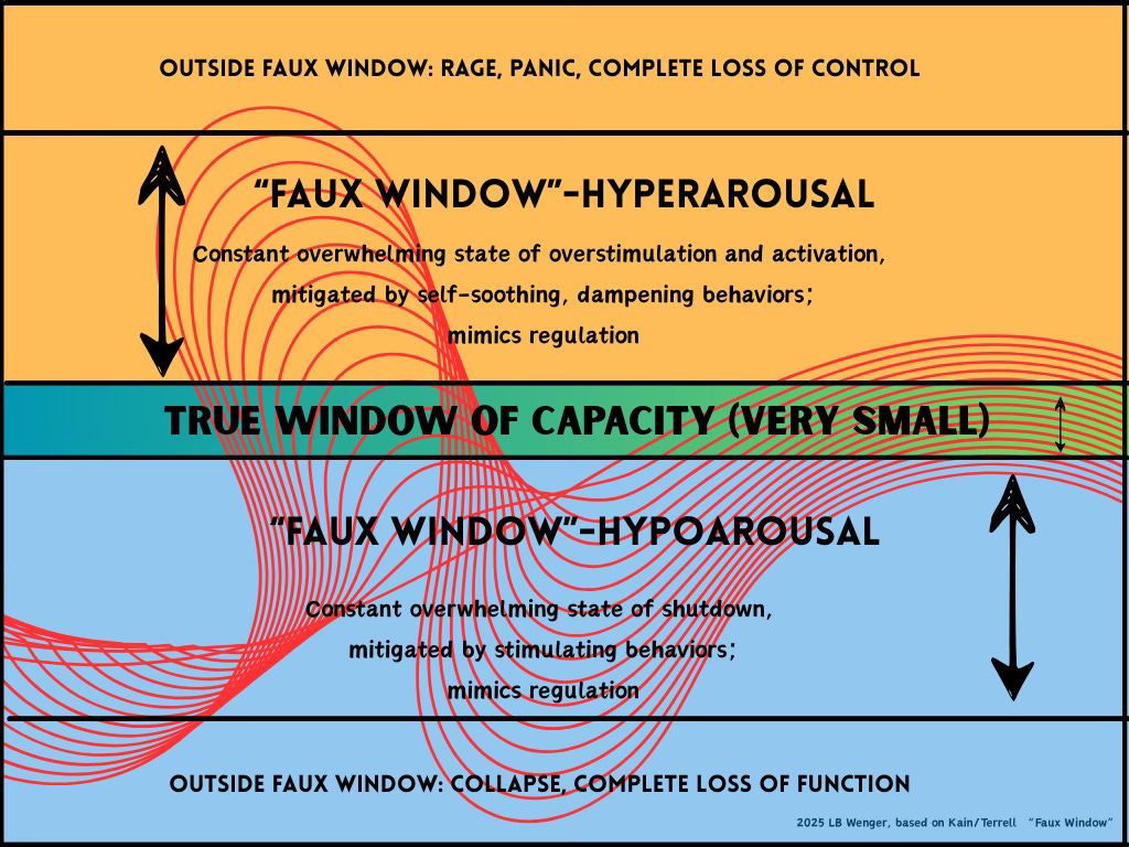 “In the Faux Window, we create a sense of stability and regulation of arousal by narrowing our range of responses, but that narrowing means we can’t access the resilience that is affiliated with having flexibility and the full range in our response systems— what we would have with a healthy Window.”