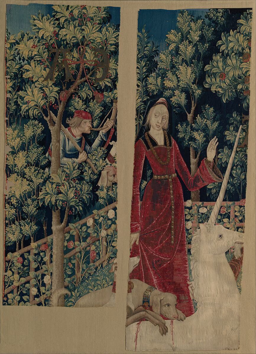 The Unicorn Tapestries depict the hunt and capture of the unicorn, which may symbolize the pursuit of love, or the Christian myth— or both, of course. I’ve taken some liberties with the symbolism for this post, but the same archetypal truth applies. While the hunters stamp through the woods with their hounds and horns, cornering the beast, driving it into a frenzied defense— it is only, finally, through the touch of a “maiden”— that is, through Eros, relationality, pure empathetic connection— that the unicorn is “tamed,” though he still retains his beauty and magical form.