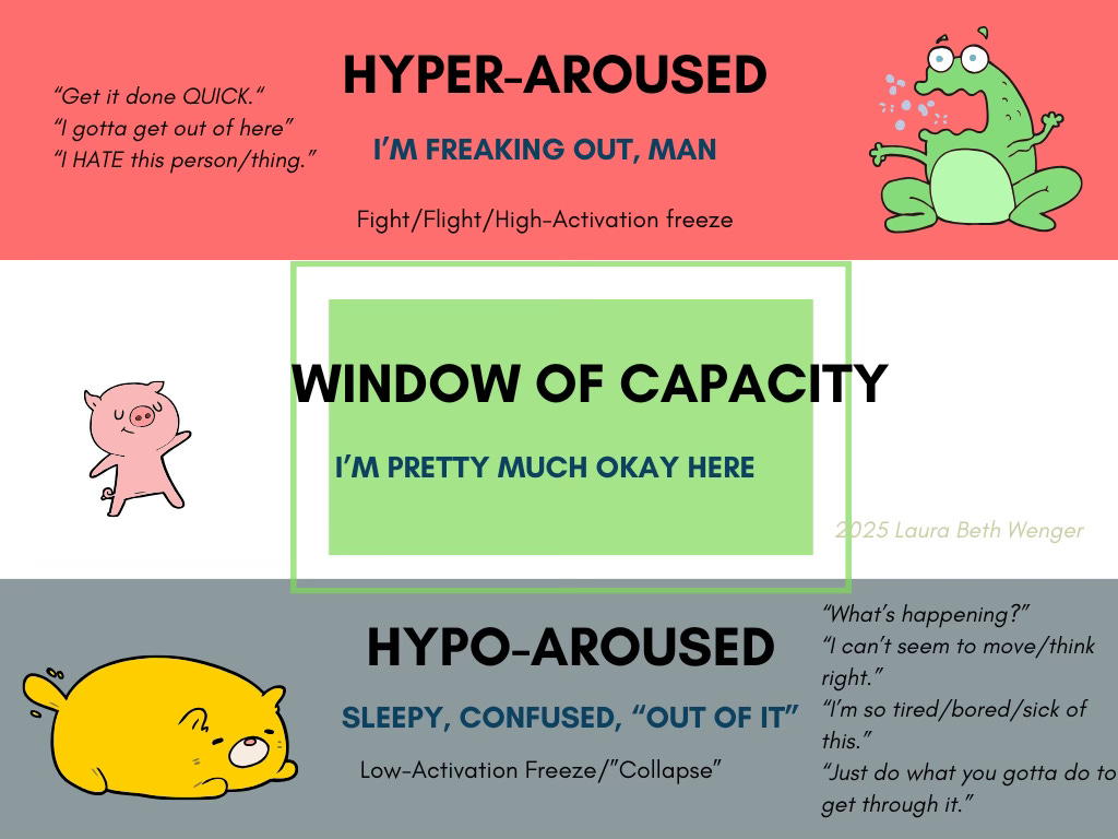The Window of Capacity is a way to talk about our nervous system (or, our body/psyche system). If you’ve never seen it before, it’s pretty simple. When we’re in the middle of our window, things are going okay; we can handle the environment and stressors we’re faced with.