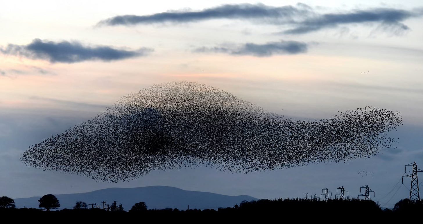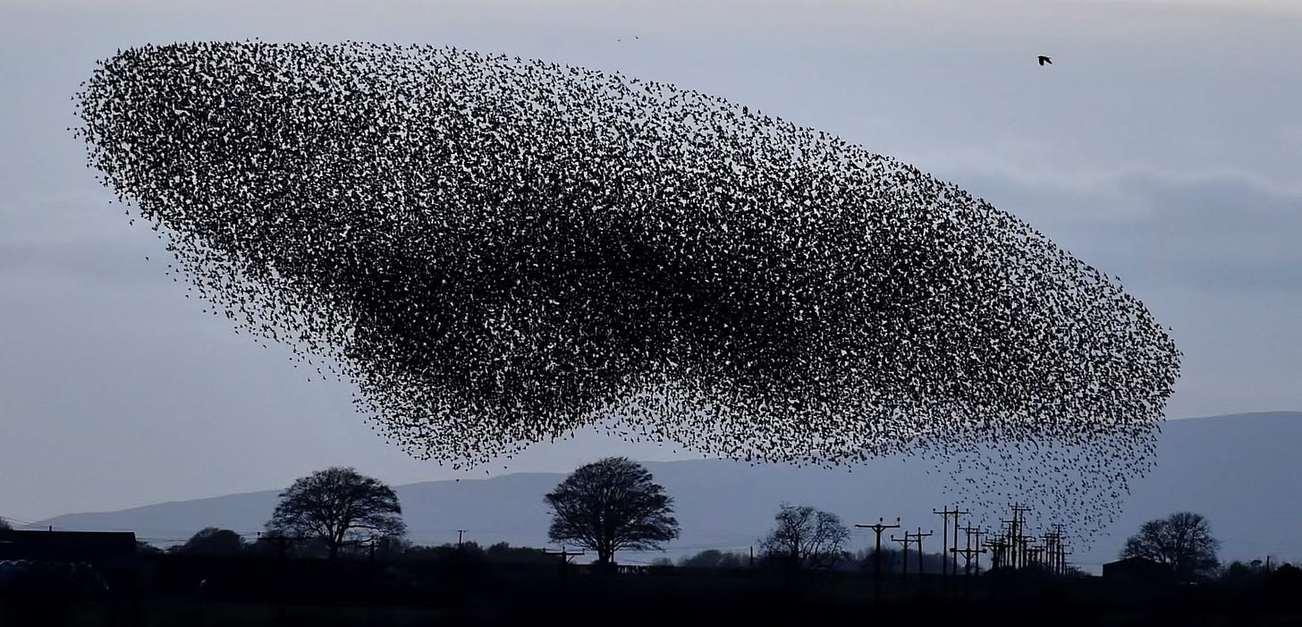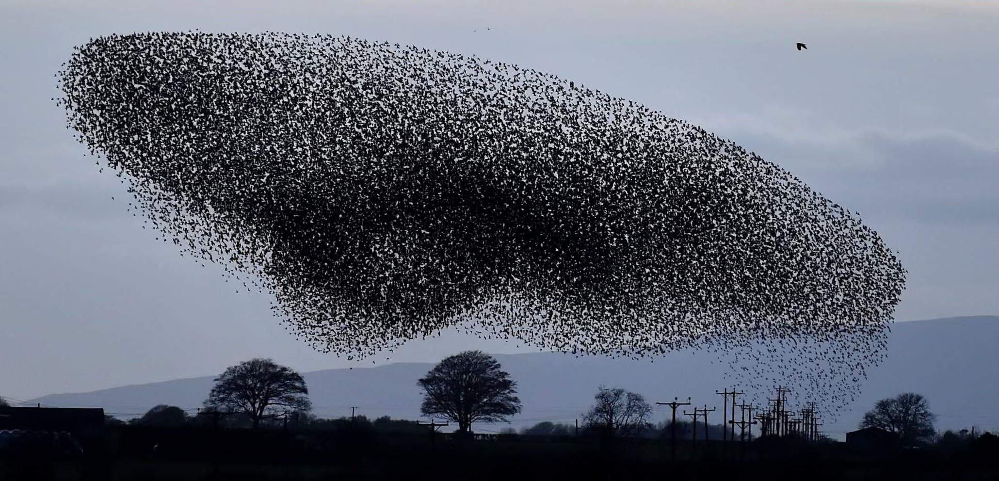 “Guided by simple rules, starling murmurations can react to their environment as a group without a central leader orchestrating their choices; in any instant, any part of the flock can transform the movement of the whole flock.”
